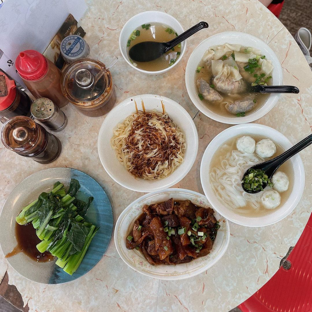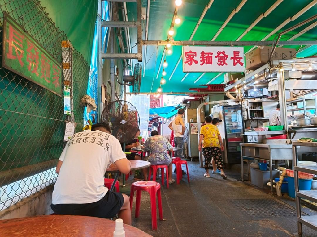 Stepping into the stall is like stepping back in time. The metal shutters open up to a compact kitchen with an open facade, where you can see the lively scene of chefs preparing dishes over a hot wok stove. The dining area features casual bench seating topped with checkered tablecloths. Framed newspaper clippings and food photos line the walls, featuring pictorial records of Cheung Fat Noodles over the past decades. Though simple and no-frills, the retro aesthetics give the diner a lot of old-school charm.