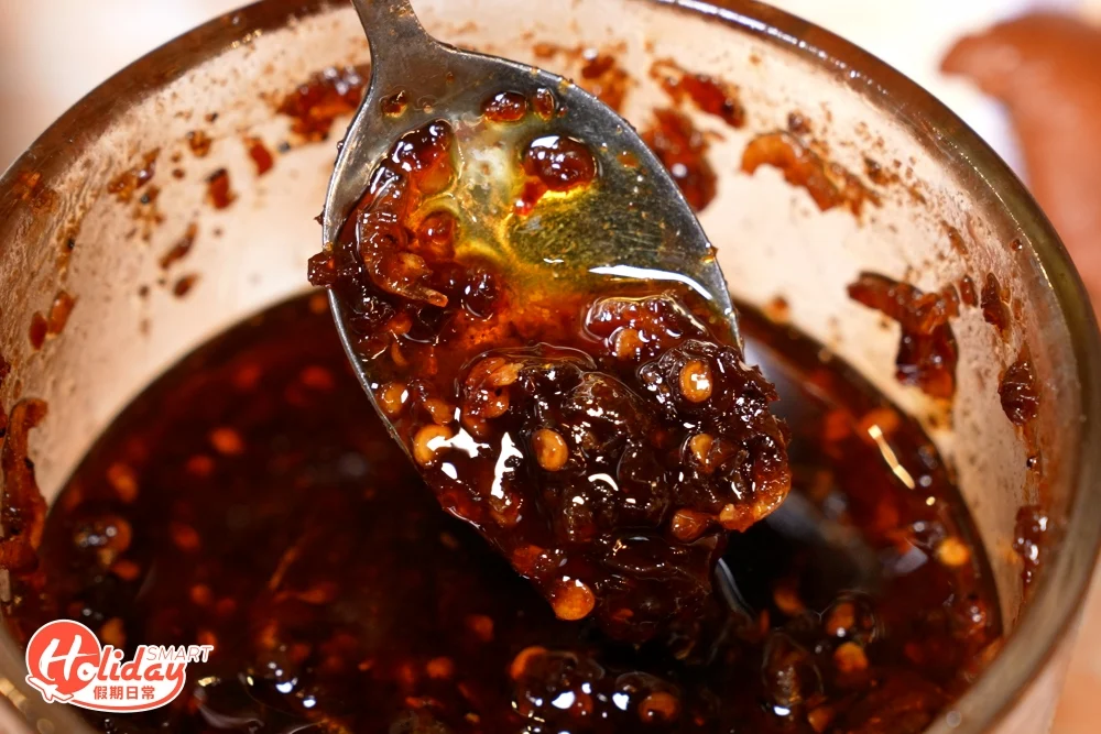 Homemade chili oil accompanies the dish, with crushed chilies, shallots and dried shrimp infused in oil. Adding the spicy chili oil brightens the flavor of the soy sauce-braised noodles. The heat also helps to cut through the heartiness of the dish, allowing you to consume more spoonfuls.