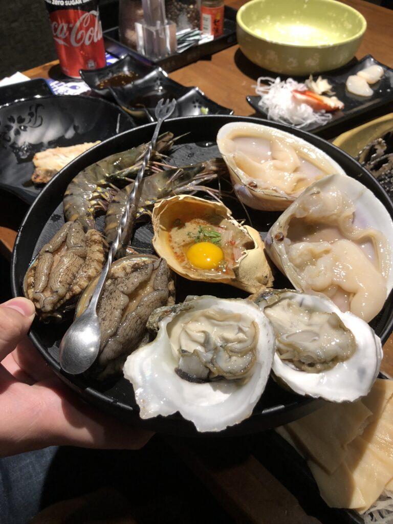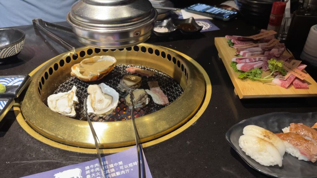 The meal starts with a premium seafood platter, which you can order more of al-la-carte. We felt it wasn’t so necessary to order the extra premium seafood as the normal buffet menu already included oysters, crab, and shrimp. No alcoholic drinks besides cheap beer were included; they cost extra. However, no other restaurant offers such a variety and quality in a yakiniku bbq buffet for this price. Worth checking out if you have an appetite for a grilled wagyu buffet.