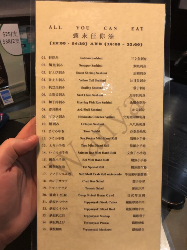For only HKD188, you get access to Japanese clay pot dishes, lamb skewers, sake, sashimi, hand rolls, sushi, eel, ice cream, tempura, sodas, teas, and snacks. For this price, there is nothing else like it. It is even cheaper if you go during their lunchtime buffet; however, price changes frequently, so for exact pricing, you will need to confirm on arrival.